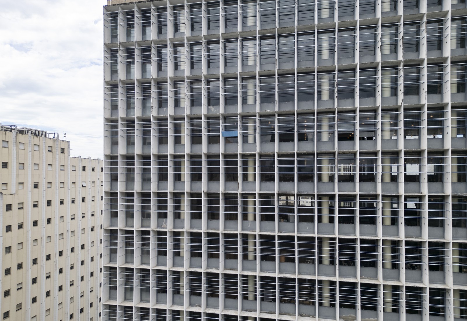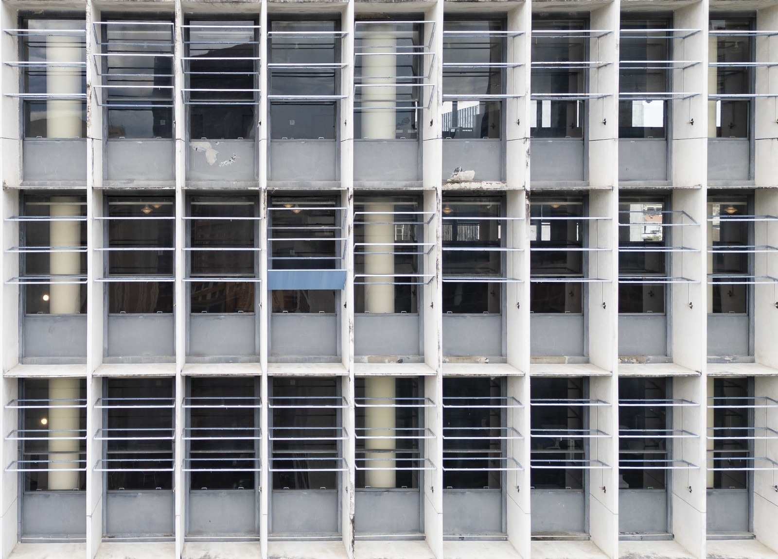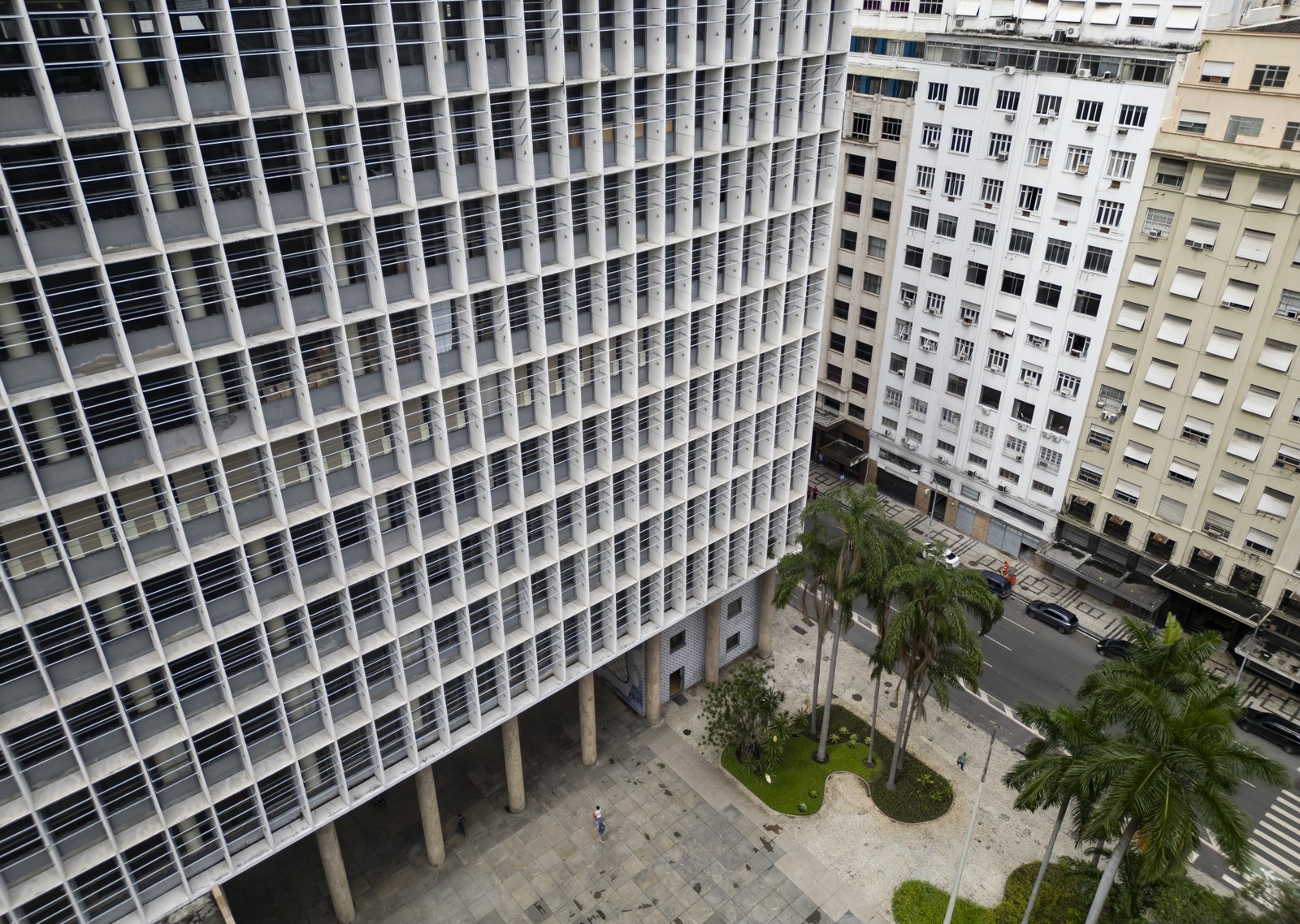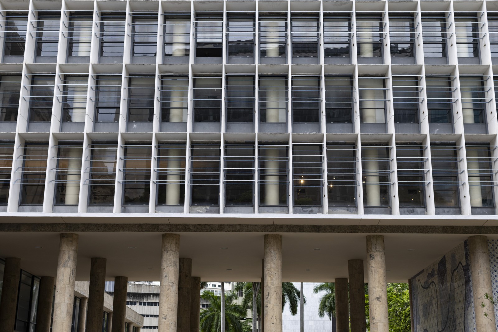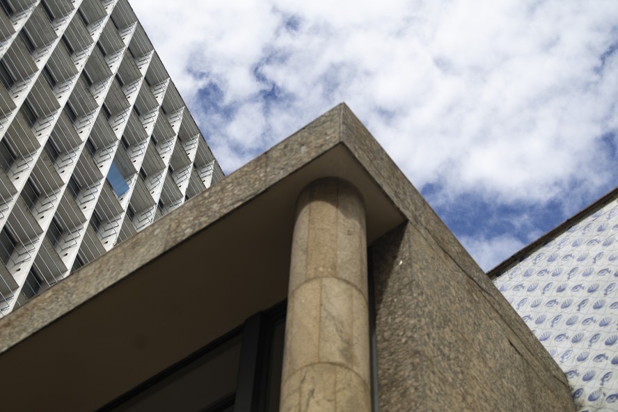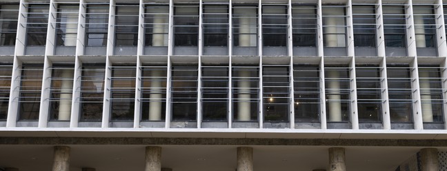 A fachada norte do Palácio Capanema está sem o sistema de brise-soleil desde 2022,apenas uma lâmina foi deixada como modelo — Foto: Márcia Foletto
