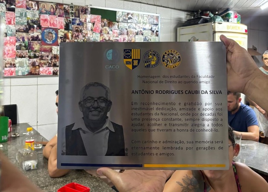 De um lado da Rua Moncorvo Filho,no Centro do Rio,está a Faculdade Nacional de Direito (FND),da UFRJ. Do outro,o Bar e Restaurante Coração de Maria,conhecido por muitos como o "Bar do Caubi",referência ao garçom que durante 28 anos recebeu a todos de sorriso aberto e astral no alto. Mas,no último domingo,Antônio Caubi Rodrigues da Silva morreu,aos 61 anos: para homenageá-lo,grupos ligados à faculdade organizaram um evento na noite desta quarta-feira,coroado com a confecção de uma placa em reconhecimento à parceria de longa data.