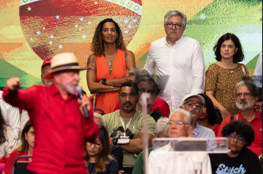 Lula discursa na festa de aniversário do PT sob os olhares de Padilha (de camisa branca) e Nísia (em pé,à direita): presidente já comunicou alguns aliados sobre a troca na Saúde — Foto: Eduardo Anzelli/ Folha Press